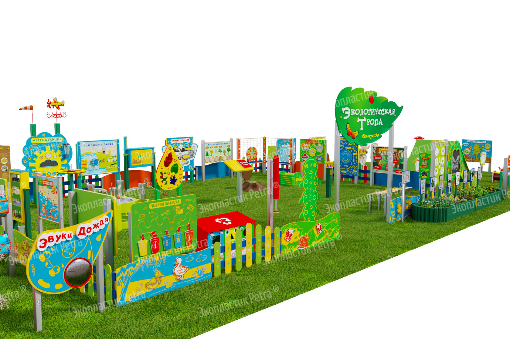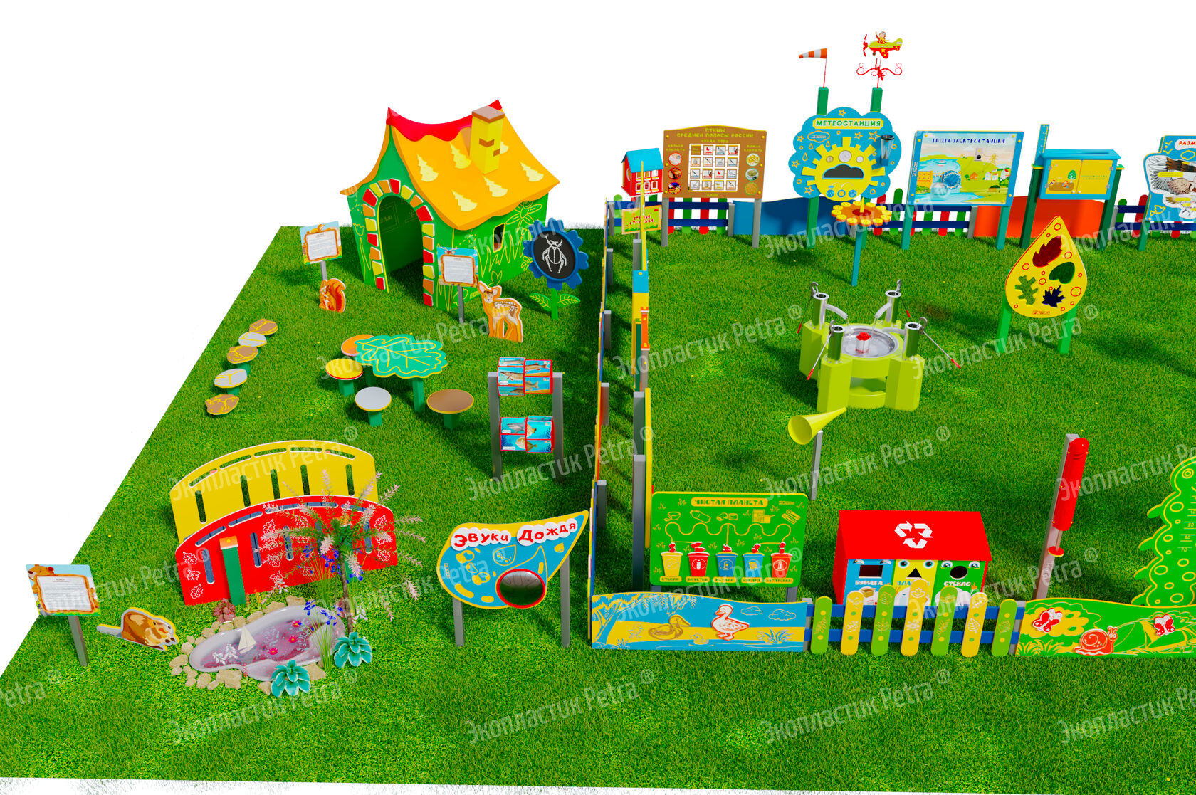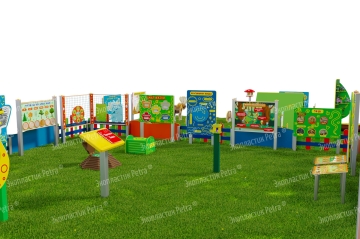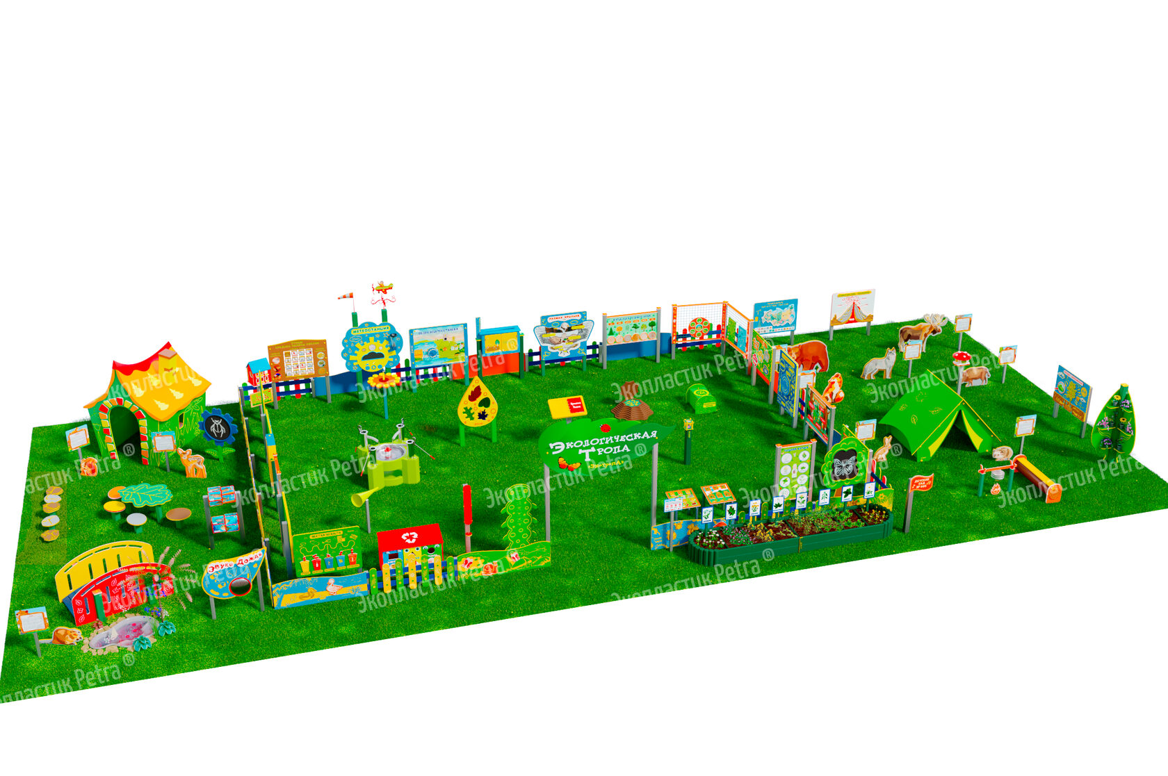 1. Размер площадки: 21м х 9м* 2. Заборчик «Художественные декоративные панели» из экопластика Petra ® и нержавеющей стали - 11 секций 3. Заборчик «Лесной» из экопластика Petra ® и нержавеющей стали - 12 секций. Размер зонирования: 10,5м х 7,5м 4. Входная группа «Экологическая тропа «Экотропа» с опорами из нержавеющей стали 5. Стенд «Правила безопасности на площадке» с опорой из нержавеющей стали 6. «Вечная грядка» с краями полусферой (на выбор 5 видов грядок) из брусков полимерного пластика 7. Набор семян лекарственных растений (ромашка, мята, зверобой, подорожник, чистотел, крапива, мелисса, одуванчик) 8. Тропа здоровья «Камешки» 9. Модуль интерактивный «Дуновение ветерка» из экопластика Petra ® и нержавеющей стали 10. Модуль интерактивный «Капли дождя» из экопластика Petra ® и нержавеющей стали 11. Методический стенд о животных «Белка» с опорой из нержавеющей стали 12. Методический стенд о животных «Бобр» с опорой из нержавеющей стали 13. Методический стенд о животных «Волк» с опорой из нержавеющей стали 14. Методический стенд о животных «Ёж с опорой из нержавеющей стали 15. Методический стенд о животных «Заяц» с опорой из нержавеющей стали 16. Методический стенд о животных «Кабан» с опорой из нержавеющей стали 17. Методический стенд о животных «Лиса» с опорой из нержавеющей стали 18. Методический стенд о животных «Лось» с опорой из нержавеющей стали 19. Методический стенд о животных «Медведь» с опорой из нержавеющей стали 20. Методический стенд о животных «Олень» с опорой из нержавеющей стали 21. «Флаг учреждения» из экопластика Petra ® и нержавеющей стали 22. Модуль «Природные богатства России» из экопластика Petra ® и нержавеющей стали 23. Модуль «Извержение вулкана» из экопластика Petra ® и нержавеющей стали 24. Модуль «Фотосинтез» из экопластика Petra ® и нержавеющей стали 25. Стол для творчества с сиденьями «Дубовый лист» из экопластика Petra ® 26. Оптический развивающий модуль в форме капли «Калейдоскоп-листопад» из экопластика Petra ® и нержавеющей стали 27. МАФ для конспектирования «Василек» из экопластика Petra ® и нержавеющей стали 28. Интерактивный звуковой модуль «Звуки лесных животных» из экопластика Petra ® и нержавеющей стали 29. Портативная Метеостанция «Солнышко» (на выбор 7 видов портативных метеостанций) из цельнолитого листа экопластика Petra ® с ""эффектом кожи"": • Флюгер «Мультиподвижный самолет» / Петушок (на выбор) • Стороны света С-Ю-З-В • Ветровой рукав • Прибор «Сбор осадков» • Магнитно-меловая доска / маркерная доска (на выбор) • Прибор Барометр • Прибор Гигрометр • Прибор Термометр • Прибор Солнечные часы из армированного пластика • Программа работы на Метеостанции • Дневник наблюдений за погодой 30. Интерактивный модуль «Раздельный сбор мусора» из экопластика Petra ® 31. Игровая зона «Сказочный домик с мебелью» (на выбор 10 видов домиков) из экопластика Petra ® и нержавеющей стали 32. Игровая зона «Привал на полянке»: Палатка (на выбор 9 видов) из экопластика Petra ® и нержавеющей стали , лавка-бревно, котелок на стойках и костер, гитара, фонарик, компас 33. Табличка «Привал на полянке» с опорами из нержавеющей стали 34. Игровая зона «Мостик и декоративный водоем» из экопластика Petra ® 35. Модуль интерактивный «Рыбы» из экопластика Petra ® и нержавеющей стали 36. Модуль интерактивный «Стихия воды» из атмосферостойкого пластика и нержавеющей стали 37. Тактильный топиарий «Дерев