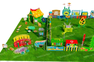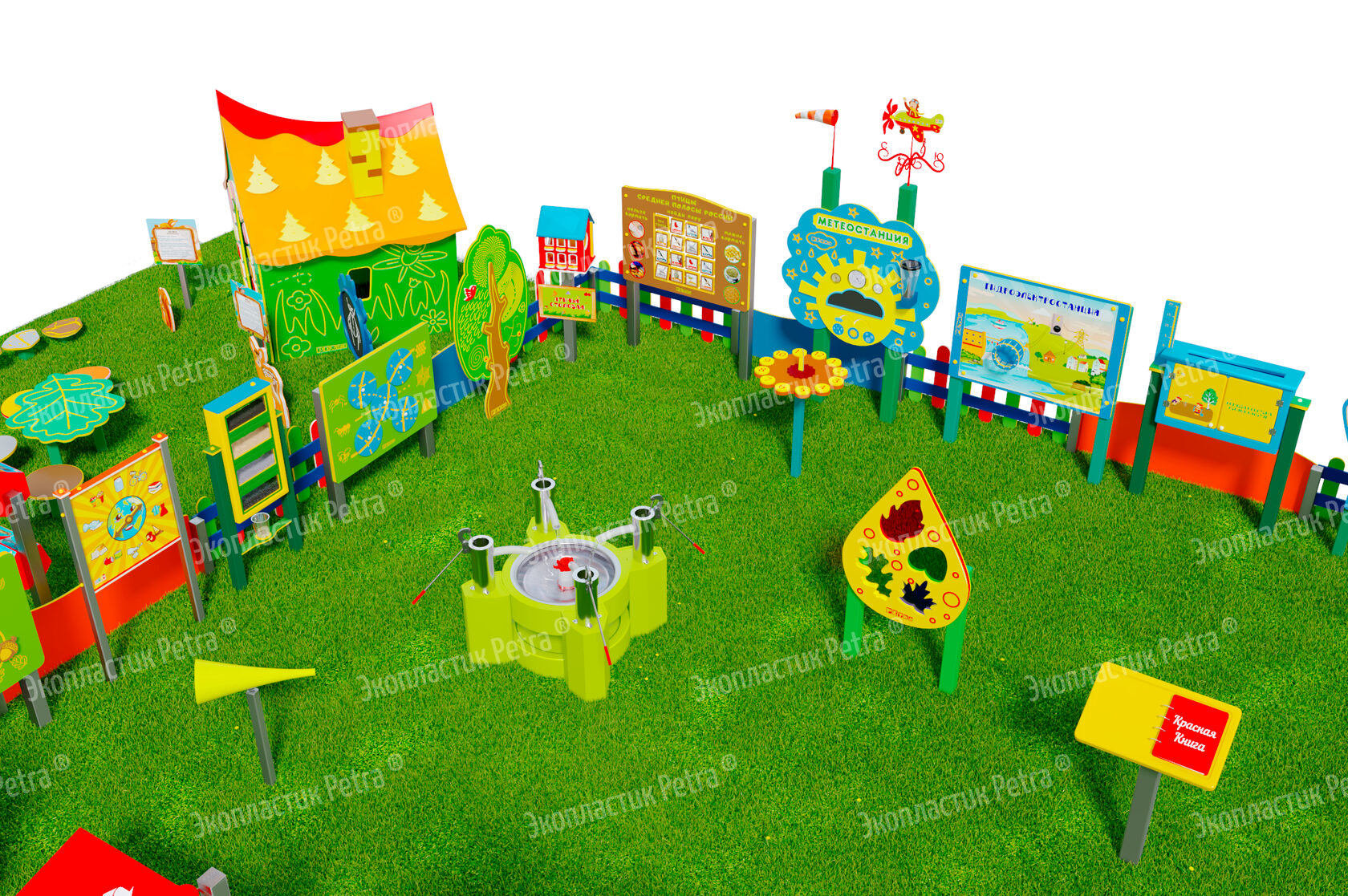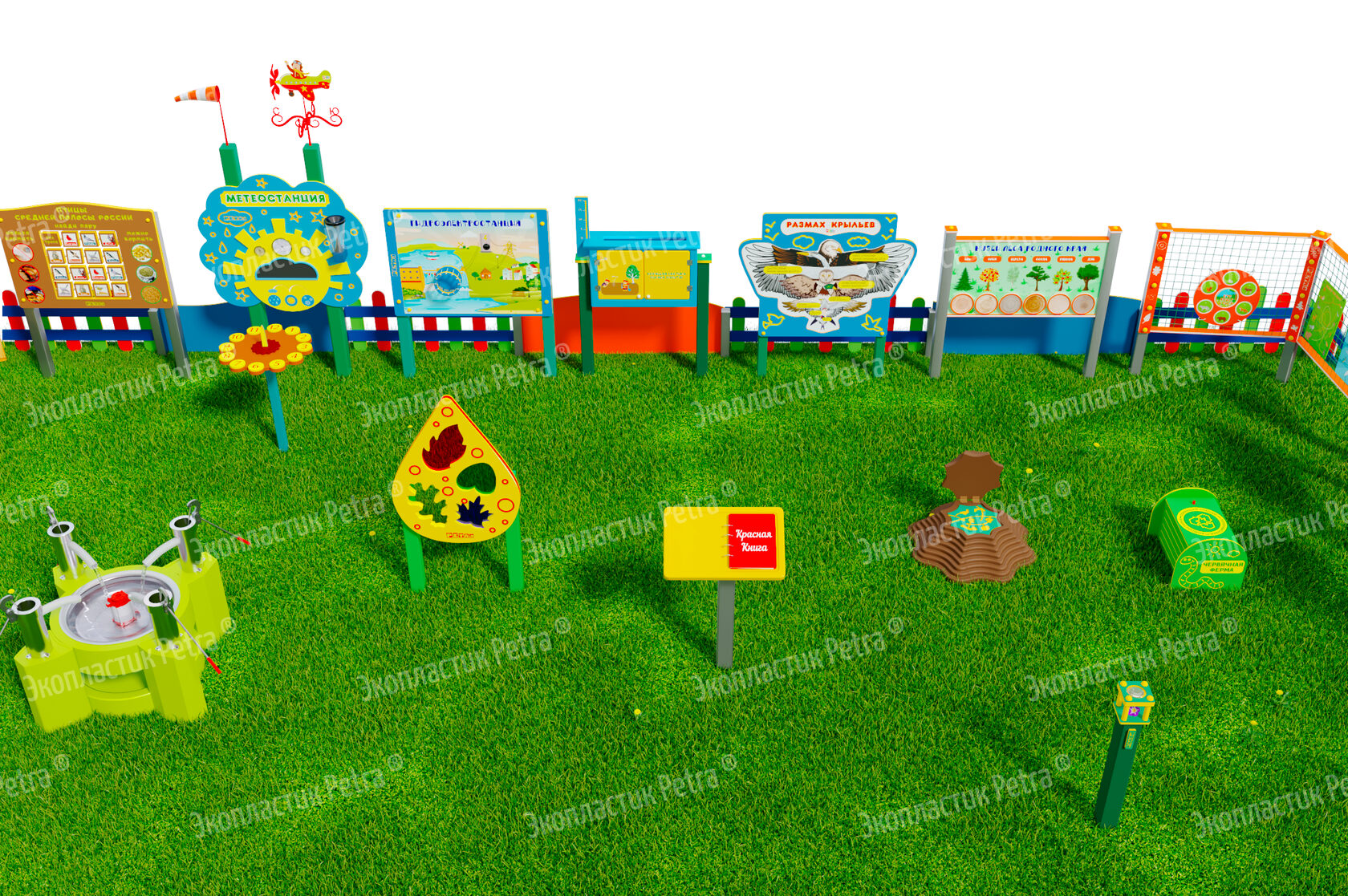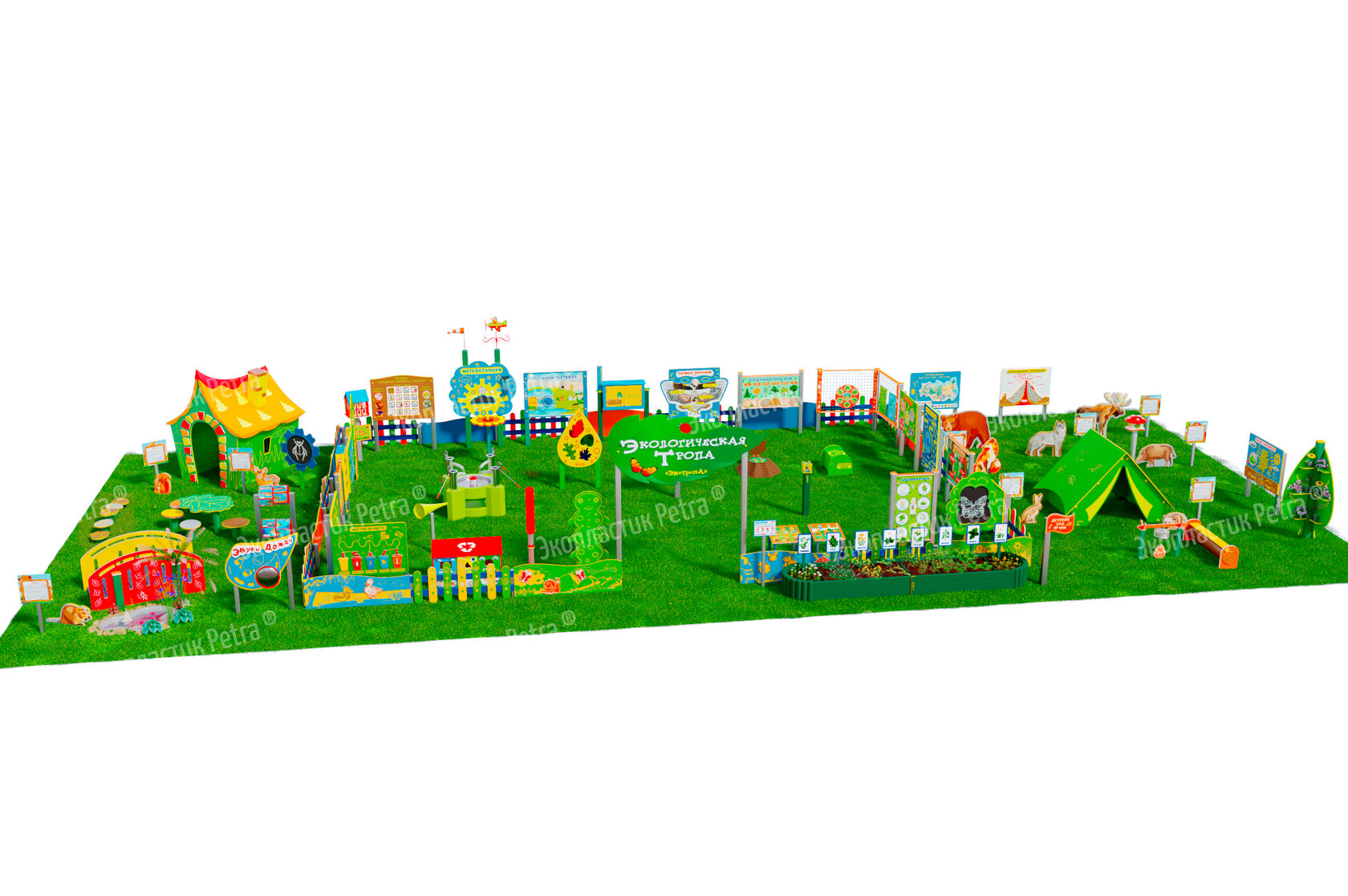 1. Размер площадки: 21м х 9м* 2. Заборчик «Художественные декоративные панели» из экопластика Petra ® и нержавеющей стали - 11 секций 3. Заборчик «Лесной» из экопластика Petra ® и нержавеющей стали - 12 секций. Размер зонирования: 10,5м х 7,5м 4. Входная группа «Экологическая тропа «Экотропа» с опорами из нержавеющей стали 5. Стенд «Правила безопасности на площадке» с опорой из нержавеющей стали 6. «Вечная грядка» с краями полусферой (на выбор 5 видов грядок) из брусков полимерного пластика 7. Набор семян лекарственных растений (ромашка, мята, зверобой, подорожник, чистотел, крапива, мелисса, одуванчик) 8. Тропа здоровья «Камешки» 9. Модуль интерактивный «Дуновение ветерка» из экопластика Petra ® и нержавеющей стали 10. Модуль интерактивный «Капли дождя» из экопластика Petra ® и нержавеющей стали 11. Методический стенд о животных «Белка» с опорой из нержавеющей стали 12. Методический стенд о животных «Бобр» с опорой из нержавеющей стали 13. Методический стенд о животных «Волк» с опорой из нержавеющей стали 14. Методический стенд о животных «Ёж с опорой из нержавеющей стали 15. Методический стенд о животных «Заяц» с опорой из нержавеющей стали 16. Методический стенд о животных «Кабан» с опорой из нержавеющей стали 17. Методический стенд о животных «Лиса» с опорой из нержавеющей стали 18. Методический стенд о животных «Лось» с опорой из нержавеющей стали 19. Методический стенд о животных «Медведь» с опорой из нержавеющей стали 20. Методический стенд о животных «Олень» с опорой из нержавеющей стали 21. «Флаг учреждения» из экопластика Petra ® и нержавеющей стали 22. Модуль «Природные богатства России» из экопластика Petra ® и нержавеющей стали 23. Модуль «Извержение вулкана» из экопластика Petra ® и нержавеющей стали 24. Модуль «Фотосинтез» из экопластика Petra ® и нержавеющей стали 25. Стол для творчества с сиденьями «Дубовый лист» из экопластика Petra ® 26. Оптический развивающий модуль в форме капли «Калейдоскоп-листопад» из экопластика Petra ® и нержавеющей стали 27. МАФ для конспектирования «Василек» из экопластика Petra ® и нержавеющей стали 28. Интерактивный звуковой модуль «Звуки лесных животных» из экопластика Petra ® и нержавеющей стали 29. Портативная Метеостанция «Солнышко» (на выбор 7 видов портативных метеостанций) из цельнолитого листа экопластика Petra ® с ""эффектом кожи"": • Флюгер «Мультиподвижный самолет» / Петушок (на выбор) • Стороны света С-Ю-З-В • Ветровой рукав • Прибор «Сбор осадков» • Магнитно-меловая доска / маркерная доска (на выбор) • Прибор Барометр • Прибор Гигрометр • Прибор Термометр • Прибор Солнечные часы из армированного пластика • Программа работы на Метеостанции • Дневник наблюдений за погодой 30. Интерактивный модуль «Раздельный сбор мусора» из экопластика Petra ® 31. Игровая зона «Сказочный домик с мебелью» (на выбор 10 видов домиков) из экопластика Petra ® и нержавеющей стали 32. Игровая зона «Привал на полянке»: Палатка (на выбор 9 видов) из экопластика Petra ® и нержавеющей стали , лавка-бревно, котелок на стойках и костер, гитара, фонарик, компас 33. Табличка «Привал на полянке» с опорами из нержавеющей стали 34. Игровая зона «Мостик и декоративный водоем» из экопластика Petra ® 35. Модуль интерактивный «Рыбы» из экопластика Petra ® и нержавеющей стали 36. Модуль интерактивный «Стихия воды» из атмосферостойкого пластика и нержавеющей стали 37. Тактильный топиарий «Дерев