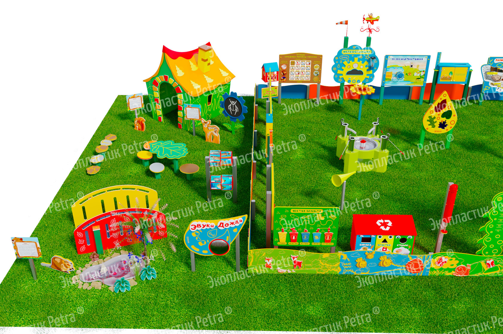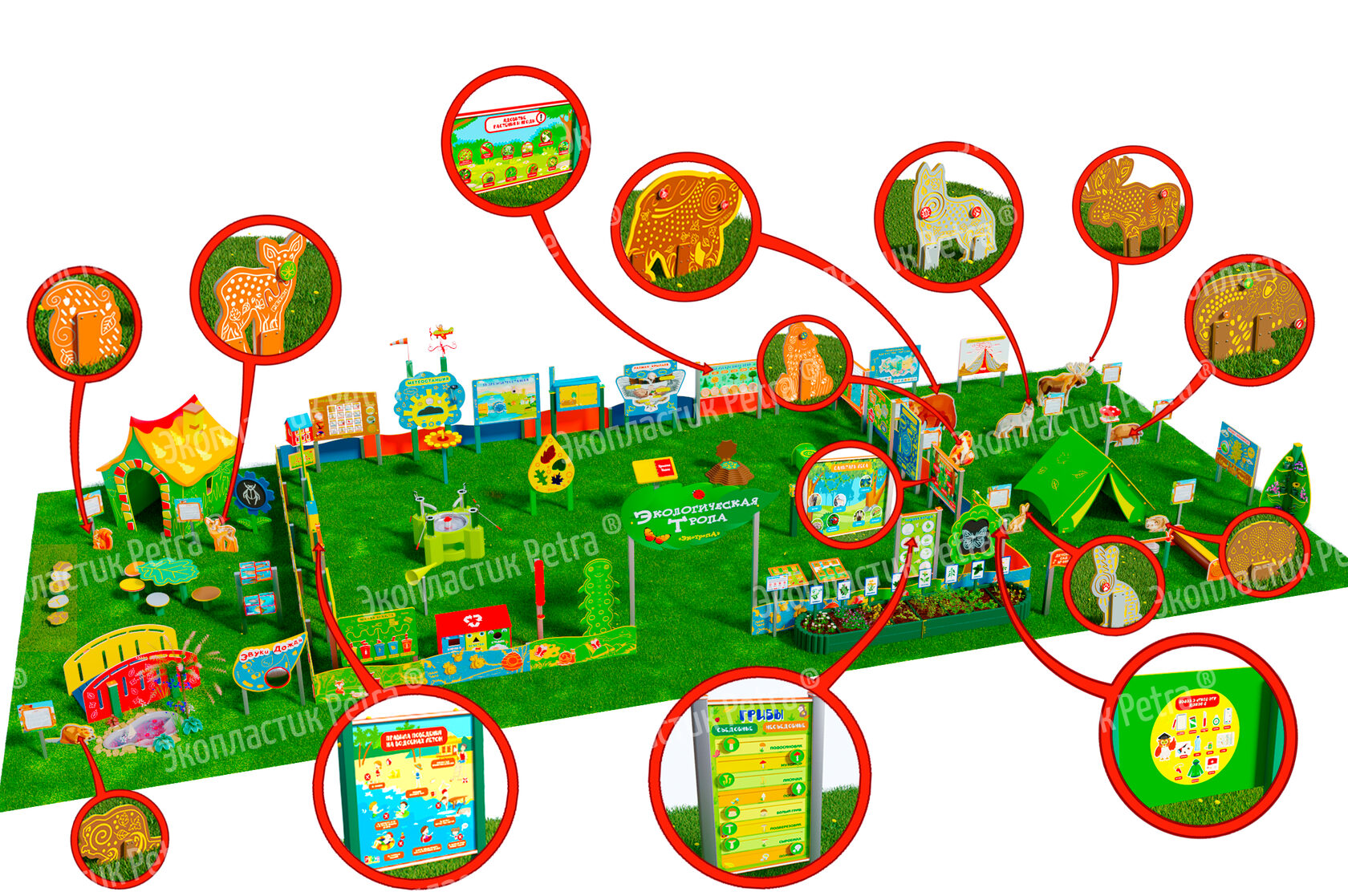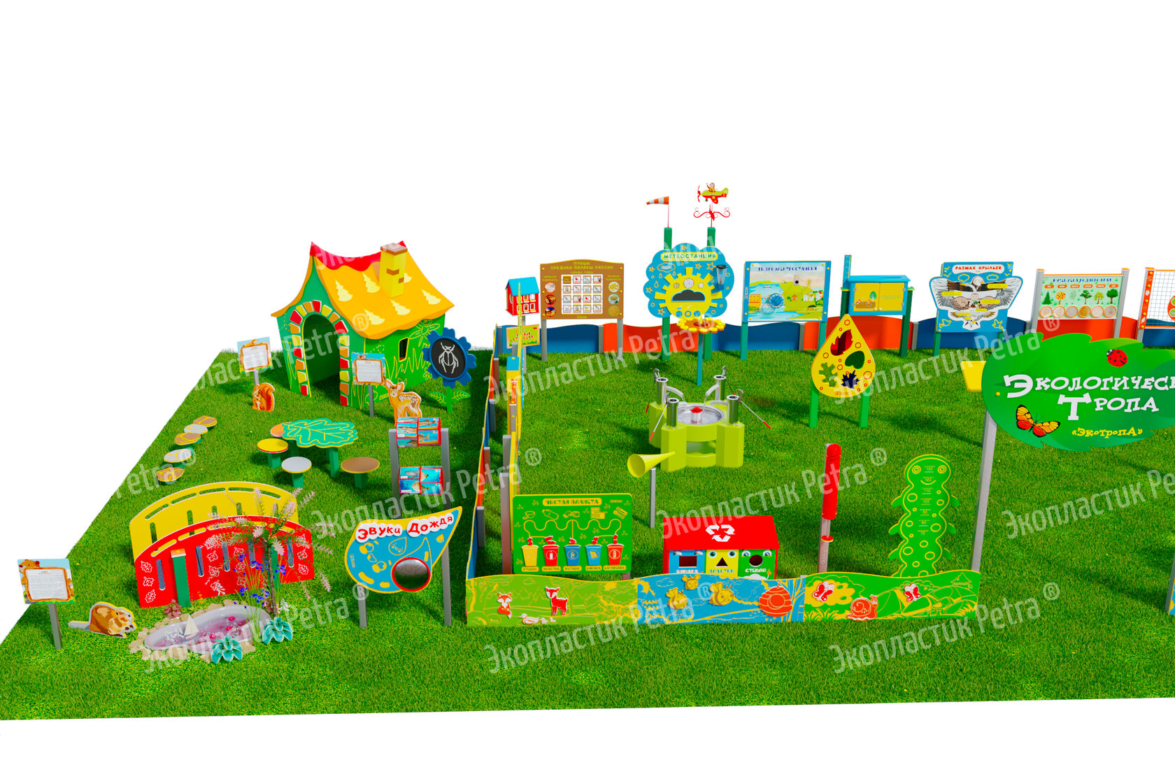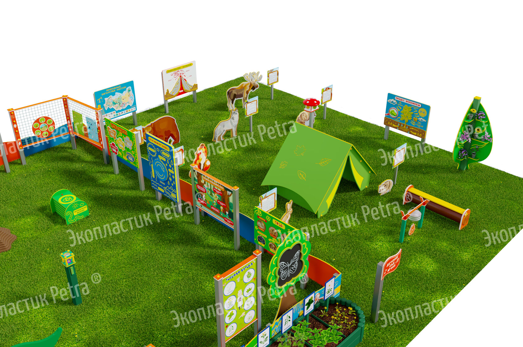 1. Размер площадки: 21м х 9м* 2. Заборчик «Художественные декоративные панели» из экопластика Petra ® и нержавеющей стали - 23 секции. Размер зонирования: 10,5м х 7,5м ***** 3. Входная группа «Экологическая тропа «Экотропа» с опорами из нержавеющей стали 4. Стенд «Правила безопасности на площадке» с опорой из нержавеющей стали 5. «Вечная грядка» с краями полусферой (на выбор 5 видов грядок) из брусков полимерного пластика 6. Набор семян лекарственных растений (ромашка, мята, зверобой, подорожник, чистотел, крапива, мелисса, одуванчик) 7. Тропа здоровья «Камешки» 8. Модуль интерактивный «Дуновение ветерка» из экопластика Petra ® и нержавеющей стали 9. Модуль интерактивный «Капли дождя» из экопластика Petra ® и нержавеющей стали 10. Методический стенд о животных «Белка» с опорой из нержавеющей стали 11. Методический стенд о животных «Бобр» с опорой из нержавеющей стали 12. Методический стенд о животных «Волк» с опорой из нержавеющей стали 13. Методический стенд о животных «Ёж с опорой из нержавеющей стали 14. Методический стенд о животных «Заяц» с опорой из нержавеющей стали 15. Методический стенд о животных «Кабан» с опорой из нержавеющей стали 16. Методический стенд о животных «Лиса» с опорой из нержавеющей стали 17. Методический стенд о животных «Лось» с опорой из нержавеющей стали 18. Методический стенд о животных «Медведь» с опорой из нержавеющей стали 19. Методический стенд о животных «Олень» с опорой из нержавеющей стали 20. «Флаг учреждения» из экопластика Petra ® и нержавеющей стали 21. Модуль «Природные богатства России» из экопластика Petra ® и нержавеющей стали 22. Модуль «Извержение вулкана» из экопластика Petra ® и нержавеющей стали 23. Модуль «Фотосинтез» из экопластика Petra ® и нержавеющей стали 24. Стол для творчества с сиденьями «Дубовый лист» из экопластика Petra ® 25. Оптический развивающий модуль в форме капли «Калейдоскоп-листопад» из экопластика Petra ® и нержавеющей стали 26. МАФ для конспектирования «Василек» из экопластика Petra ® и нержавеющей стали 27. Интерактивный звуковой модуль «Звуки лесных животных» из экопластика Petra ® и нержавеющей стали 28. Портативная Метеостанция «Солнышко» (на выбор 7 видов портативных метеостанций) из цельнолитого листа экопластика Petra ® с ""эффектом кожи"": • Флюгер «Мультиподвижный самолет» / Петушок (на выбор) • Стороны света С-Ю-З-В • Ветровой рукав • Прибор «Сбор осадков» • Магнитно-меловая доска / маркерная доска (на выбор) • Прибор Барометр • Прибор Гигрометр • Прибор Термометр • Прибор Солнечные часы из армированного пластика • Программа работы на Метеостанции • Дневник наблюдений за погодой 29. Интерактивный модуль «Раздельный сбор мусора» из экопластика Petra ® 30. Игровая зона «Сказочный домик с мебелью» (на выбор 10 видов домиков) из экопластика Petra ® и нержавеющей стали 31. Игровая зона «Привал на полянке»: Палатка (на выбор 9 видов) из экопластика Petra ® и нержавеющей стали , лавка-бревно, котелок на стойках и костер, гитара, фонарик, компас 32. Табличка «Привал на полянке» с опорами из нержавеющей стали 33. Игровая зона «Мостик и декоративный водоем» из экопластика Petra ® 34. Модуль интерактивный «Рыбы» из экопластика Petra ® и нержавеющей стали 35. Модуль интерактивный «Стихия воды» из атмосферостойкого пластика и нержавеющей стали 36. Тактильный топиарий «Дерево» из экопластика Petra ® и нержавеющей стали 37. Интерактивный модуль 