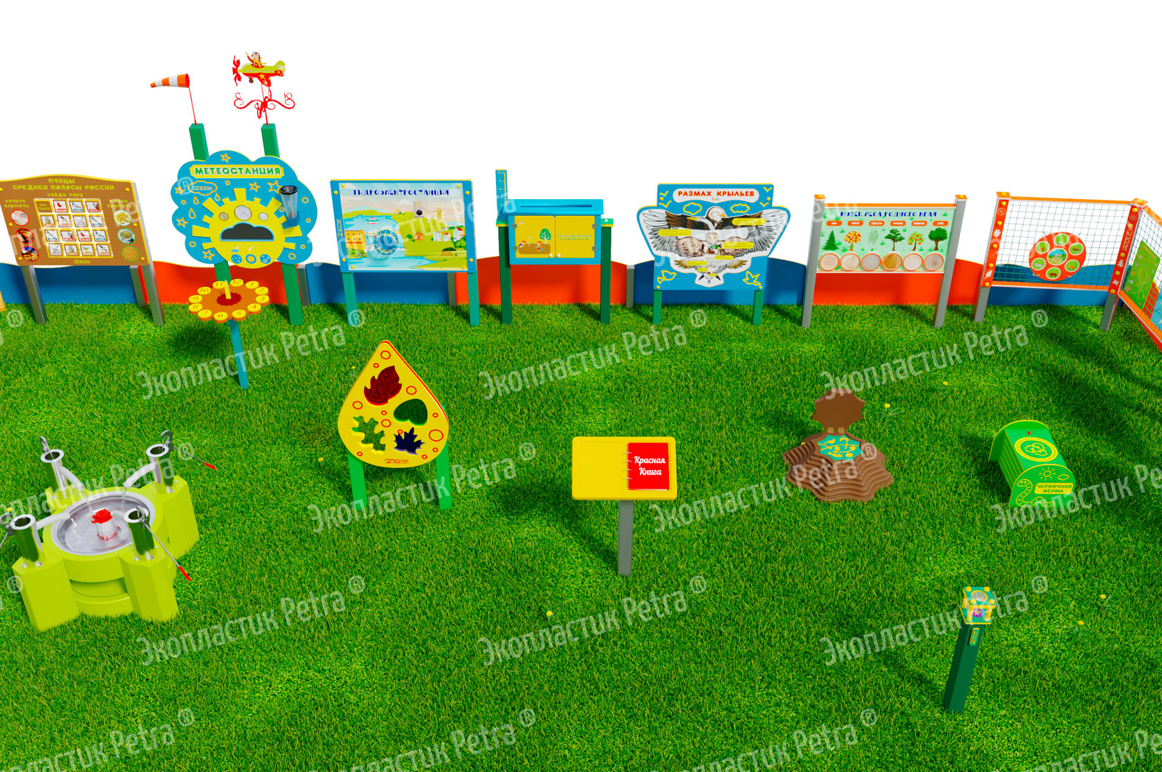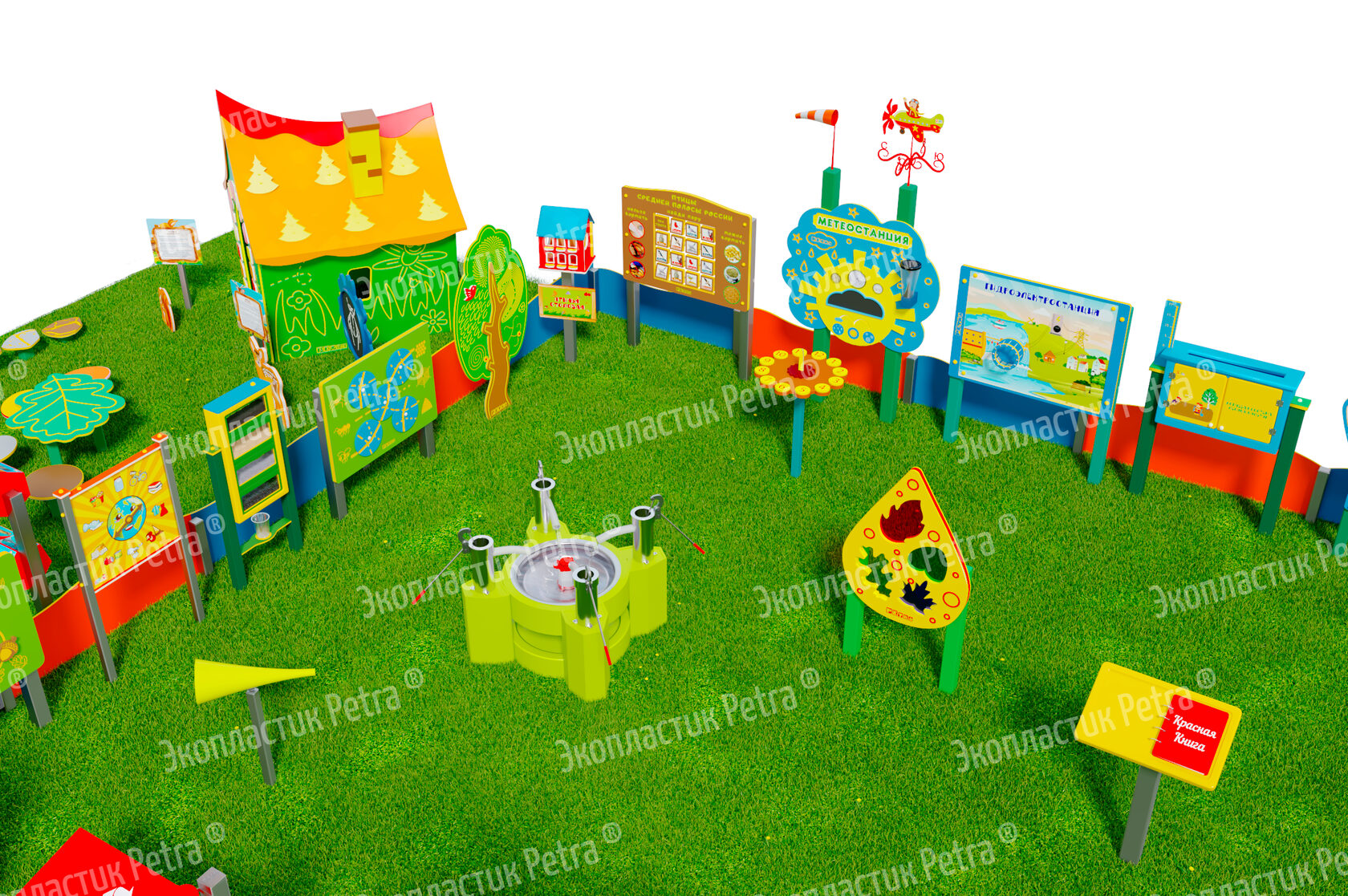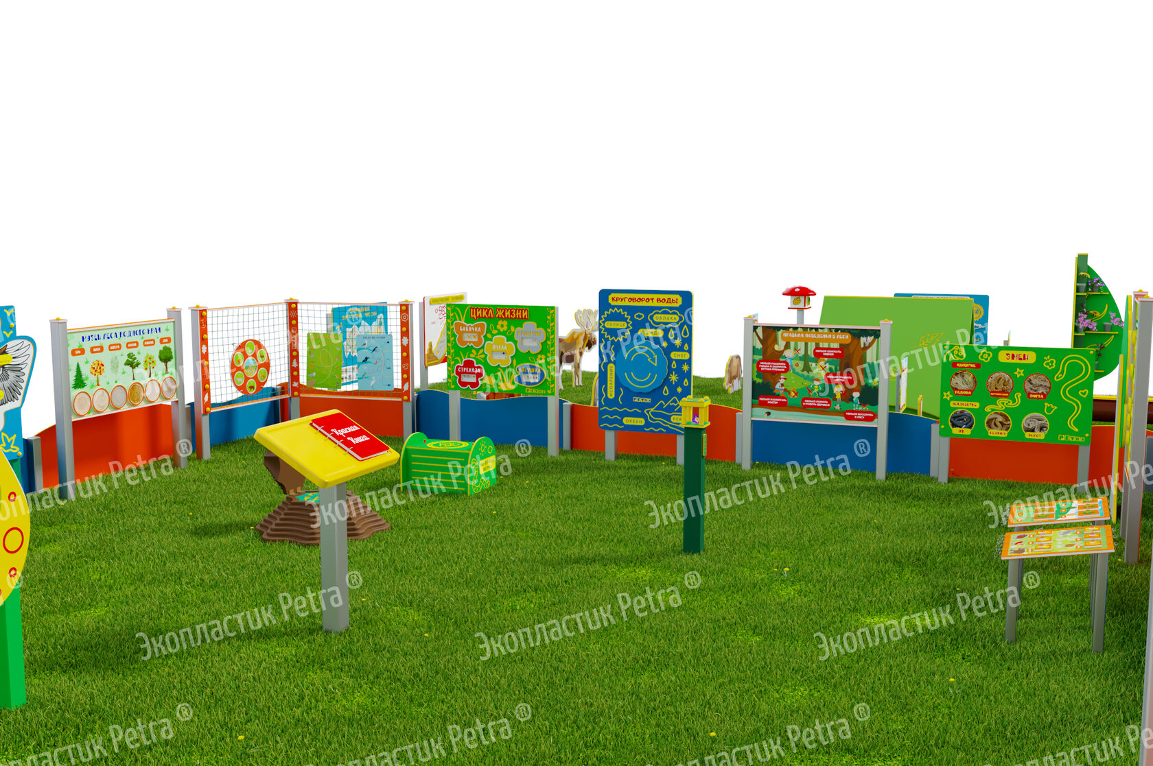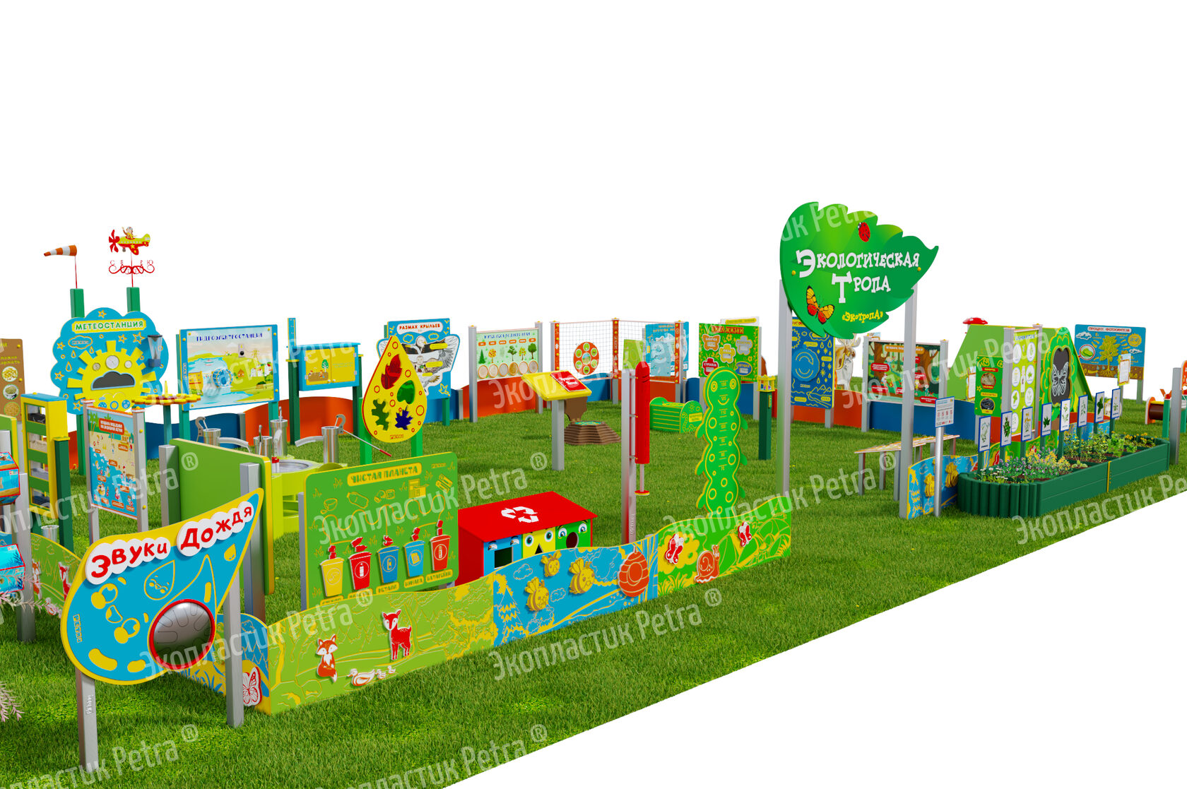 1. Размер площадки: 21м х 9м* 2. Заборчик «Художественные декоративные панели» из экопластика Petra ® и нержавеющей стали - 23 секции. Размер зонирования: 10,5м х 7,5м ***** 3. Входная группа «Экологическая тропа «Экотропа» с опорами из нержавеющей стали 4. Стенд «Правила безопасности на площадке» с опорой из нержавеющей стали 5. «Вечная грядка» с краями полусферой (на выбор 5 видов грядок) из брусков полимерного пластика 6. Набор семян лекарственных растений (ромашка, мята, зверобой, подорожник, чистотел, крапива, мелисса, одуванчик) 7. Тропа здоровья «Камешки» 8. Модуль интерактивный «Дуновение ветерка» из экопластика Petra ® и нержавеющей стали 9. Модуль интерактивный «Капли дождя» из экопластика Petra ® и нержавеющей стали 10. Методический стенд о животных «Белка» с опорой из нержавеющей стали 11. Методический стенд о животных «Бобр» с опорой из нержавеющей стали 12. Методический стенд о животных «Волк» с опорой из нержавеющей стали 13. Методический стенд о животных «Ёж с опорой из нержавеющей стали 14. Методический стенд о животных «Заяц» с опорой из нержавеющей стали 15. Методический стенд о животных «Кабан» с опорой из нержавеющей стали 16. Методический стенд о животных «Лиса» с опорой из нержавеющей стали 17. Методический стенд о животных «Лось» с опорой из нержавеющей стали 18. Методический стенд о животных «Медведь» с опорой из нержавеющей стали 19. Методический стенд о животных «Олень» с опорой из нержавеющей стали 20. «Флаг учреждения» из экопластика Petra ® и нержавеющей стали 21. Модуль «Природные богатства России» из экопластика Petra ® и нержавеющей стали 22. Модуль «Извержение вулкана» из экопластика Petra ® и нержавеющей стали 23. Модуль «Фотосинтез» из экопластика Petra ® и нержавеющей стали 24. Стол для творчества с сиденьями «Дубовый лист» из экопластика Petra ® 25. Оптический развивающий модуль в форме капли «Калейдоскоп-листопад» из экопластика Petra ® и нержавеющей стали 26. МАФ для конспектирования «Василек» из экопластика Petra ® и нержавеющей стали 27. Интерактивный звуковой модуль «Звуки лесных животных» из экопластика Petra ® и нержавеющей стали 28. Портативная Метеостанция «Солнышко» (на выбор 7 видов портативных метеостанций) из цельнолитого листа экопластика Petra ® с ""эффектом кожи"": • Флюгер «Мультиподвижный самолет» / Петушок (на выбор) • Стороны света С-Ю-З-В • Ветровой рукав • Прибор «Сбор осадков» • Магнитно-меловая доска / маркерная доска (на выбор) • Прибор Барометр • Прибор Гигрометр • Прибор Термометр • Прибор Солнечные часы из армированного пластика • Программа работы на Метеостанции • Дневник наблюдений за погодой 29. Интерактивный модуль «Раздельный сбор мусора» из экопластика Petra ® 30. Игровая зона «Сказочный домик с мебелью» (на выбор 10 видов домиков) из экопластика Petra ® и нержавеющей стали 31. Игровая зона «Привал на полянке»: Палатка (на выбор 9 видов) из экопластика Petra ® и нержавеющей стали , лавка-бревно, котелок на стойках и костер, гитара, фонарик, компас 32. Табличка «Привал на полянке» с опорами из нержавеющей стали 33. Игровая зона «Мостик и декоративный водоем» из экопластика Petra ® 34. Модуль интерактивный «Рыбы» из экопластика Petra ® и нержавеющей стали 35. Модуль интерактивный «Стихия воды» из атмосферостойкого пластика и нержавеющей стали 36. Тактильный топиарий «Дерево» из экопластика Petra ® и нержавеющей стали 37. Интерактивный модуль 
